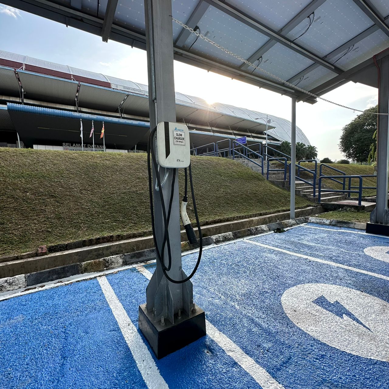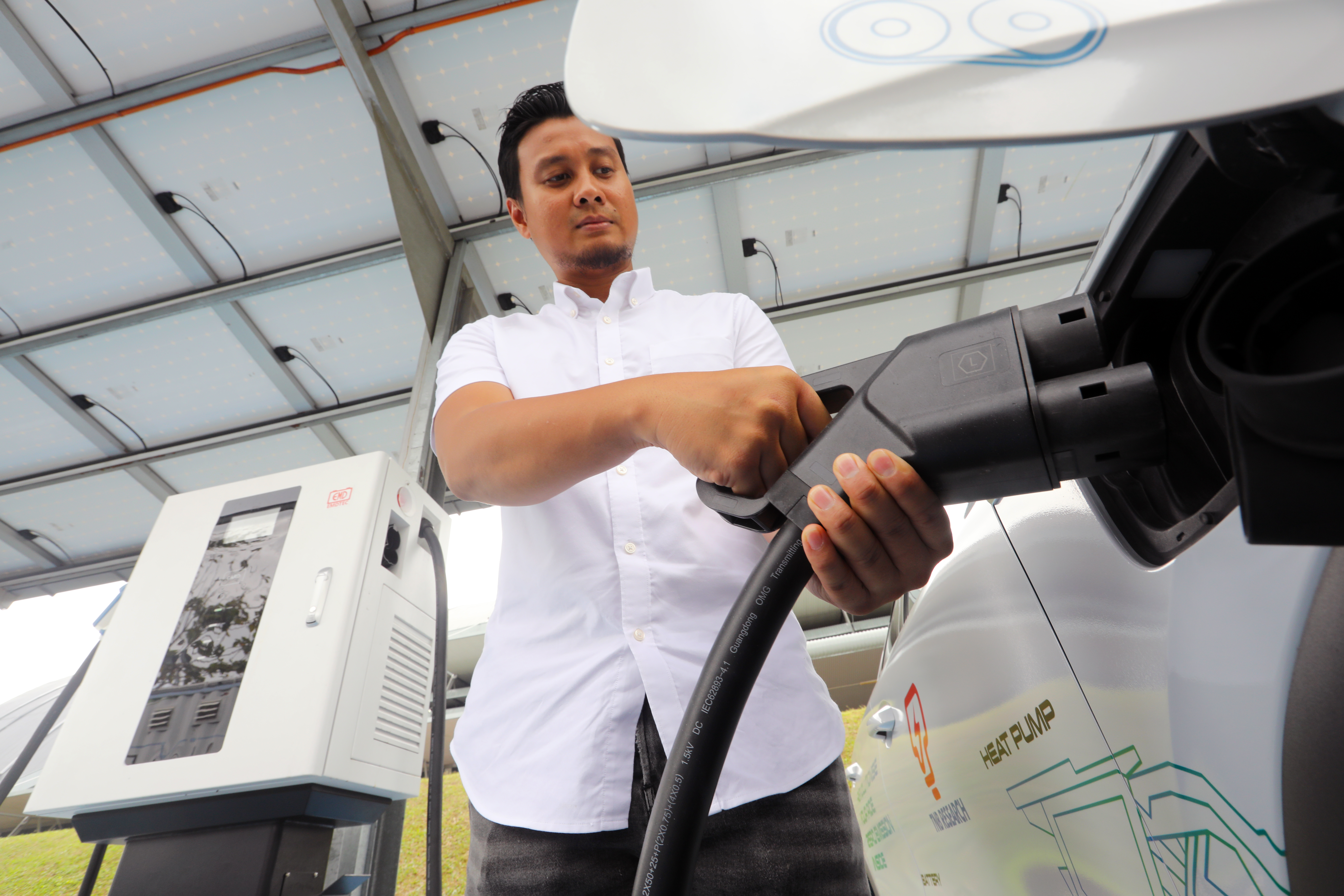The system combines solar panels that can generate 24.15 kW of power with the electrical grid to create a hybrid power source. The energy generated from these sources is stored in a battery, which can be charged using two types of chargers - a fast charger (125Amp) and a slow charger. The charging process is controlled by the integrated control system. The carport structure includes a building-integrated solar PV installation on the top roof.